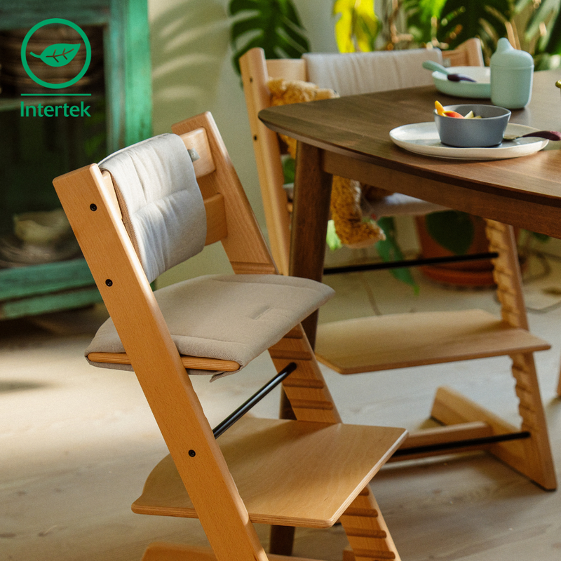 This new Tripp Trapp® Cushion is made out of 100% recycled polyester - both for the filling and the outer material. It proudly caries the Intertek Green Leaf mark, which verifies that the product meets strict environmental standards and contains recycled materials.